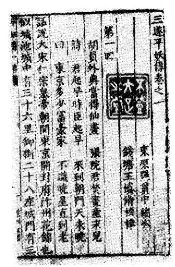 ↑《三遂平妖传》第一回回首,题“东原罗贯中编次,钱塘王慎修校梓”