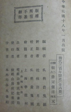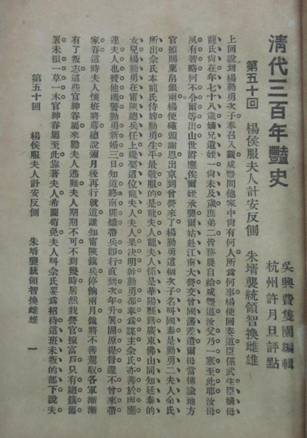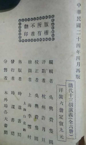 ↑清代十三朝演义,1935年4月,上海时还书局再版,平装6册,定价9元