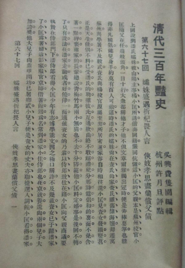 清代三百年艳史,100回。民国十八(1929)年一月,校经山房成计书局出版,吴兴费只园编辑、杭州许月旦评点。精装2册,定价5元;平装6册,定价4元。 又名《清朝三百年艳史》、《清代艳史演义》、《清代十三朝演义》等。 本书从吴三桂冲冠一怒为红颜请清兵入关为始,至宣统出宫为止,共二百八十余年。虽名为“艳史”,叙述不限于宫闱秘辛、脂香粉腻、纸醉金迷,孝义节烈、艺术方技,等出色人物,都有所辑录,其中又以诗词才女为主,恍惚诗话、才女传况味。 从陈圆圆、李香君、董小宛写起,生动地描述了柳如是泪洒虞山、十三妹为父昭冤、吕四娘誓报家仇、醋海风波贝子恋凤英、香消玉碎乾隆器香妃、赛金花重温旧梦,小凤仙恸哭情人等等,直写到瑾妃归葬西陵结束全书。 “采取的书籍,在朝在野,或庄或谐,统计有百十种。此外,文集、诗集、词集,一鳞一爪,实在记不得许多。零零碎碎,琐琐屑屑,攒凑拢来,成就了这部艳史。”作者大约力求凡事有出处,但总不乏荒诞不经之事;所录诗词亦有张冠李戴之误,比如清人填一阕《声声慢》,却是宋代才女李清照名著。 *** 书末有1928年戊辰中秋跋,云“戊辰二月,辑艳史一百回成。越三日而余妇蓐,再越七日而余妇逝。” 或谓,费只园即费有容。 费有容(1874-1931),字恕皆,号蛰园、只园。他是画家费丹旭之孙、费以群之子。早年肄业杭州紫阳书院、崇文书院和诂经精舍。光绪二十八年(1902)中式举人,次年被斥。宣统间在杭州创办《危言报》。辛亥革命以后,流寓沪上,进入爱俪园。曾任仓圣明智大学教务长,主编《广仓学会杂志》。另著有小说《邹谈一噱》、《表忠观》、《艮岳峰》等。