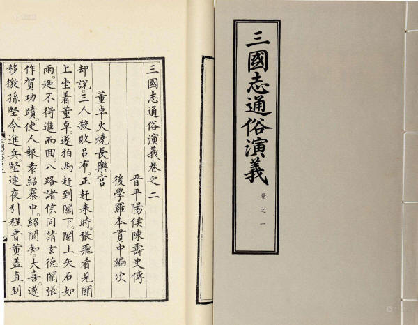 三国志通俗演义,24卷,每卷10回,共240回。题“晋平阳侯陈寿史传、后学罗本贯中编次”。前有弘治甲寅(1494)年庸愚子蒋大器序。嘉靖壬午(1522年)修髯子张尚德引。称嘉靖本、弘治本、张尚德本,也称“罗本”(但不可能是罗氏原本)。 此书早于毛本、也是流传较广的版本。书中虽有扬刘抑曹倾向,但仍不乏对曹操的赞扬,人物描写较为公允。其中较明显的错误是称曹操封关羽为“寿亭侯”,关羽不接受“寿亭侯”,曹操于是销字重刻,在寿亭侯前加一“汉”字。 *** 此版本没有花关索、关索故事,字迹端秀,印面精美,素被称为小说刻本中罕见的善本,但错误难免,多认为刊行年代最早的《三国志演义》版本。孙楷第先生《中国通俗小说书目》疑为官刻书,应是以官版为底本而翻刻的坊刻本。 *** 整理小记: 一、嘉靖本虽早于通行本毛本,但毛本并不就是从此版本修改而来。 嘉靖本里二乔、乔国老均作“桥”。107回《周瑜定计取荊州》“江南一破,休说二桥掳于铜雀宫”桥后小字注解“桥,姓。古从木傍”。 而毛本均作“乔”。第44回孔明实时诵《铜雀台赋》云:“揽‘二乔’于东南兮,乐朝夕之与共。”夹评说“旧赋云:‘连二桥于东西兮,若长空之蝃蝀。’此‘桥’也,非‘乔’也。今孔明易此二语,便轻轻划在二乔身上去。”这个解释很牵强,《铜雀台赋》为当时时文,江东也人才济济,圈里人自然不少,未必就只孔明晓得? 如果毛本从嘉靖本修改过来,人家注释得明明白白,断不会大费周章将对的改错。所以,可能二者均是从较早的版本修订而来。 二、据称,三国演义题“罗贯中编次”,从此版本始,以前并无文字记载可供佐证,甚不可靠。但作者不可能是作序的蒋大器。 蒋序称曹操为“万古奸贼”,又云“惟昭烈,汉室之胄”,以蜀汉为正统。此书曹操出场云:“为首闪出一个好英雄,身长七尺,细眼长髯。胆量过人,机谋出众,笑齐桓、晋文无匡扶之才,论赵高、王莽少纵横之策。用兵仿佛孙、吴,胸内熟谙韬略。”后面姜维征战,用词是“九犯中原”,而不是如毛本的“九伐中原”。 不排除蒋大器对原书有修订,原书也有以曹魏为正统的可能。(2017-9-19 梦远) *** 现存较早版本尚有: 明代叶逢春本三国演义,名《三国志通俗演义史传》。为日本关西大学著名学者井上泰山教授从西班牙埃斯克里亚尔皇家修道院影印而回。 黄正甫刊本《三国演义》,名《三国志传》。