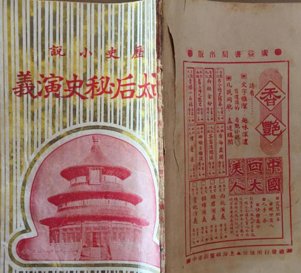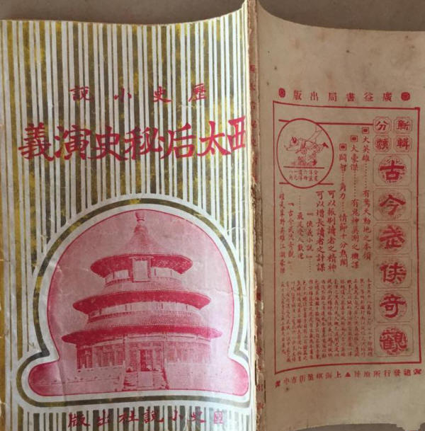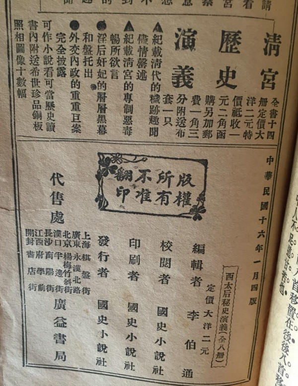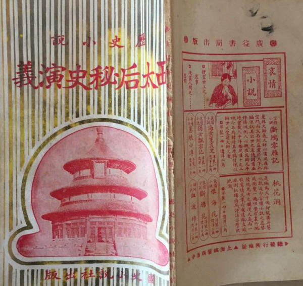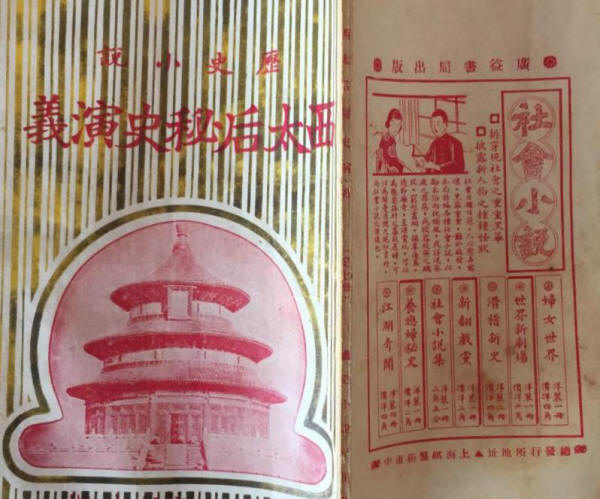 西太后秘史演义,李伯通著,8册32回,民国十年(1921)国史小说社出版,定价2元。 按正文原名应为《慈禧垂帘》或《慈禧垂帘演义》,出版时名《西太后秘史演义》,大约是为了吸人眼球。后又有以《慈禧演义》书名出版的。网上称《西太后艳史演义》,大约也是书商更名,但此书不像《清宫十三朝演义》等书侧重谈宫闱秘辛,更说不上“艳”。 叙述慈禧从兰儿到西太后的一生,以及慈禧垂帘听政其间的内政外交、军国大事。作者著书时,清亡未远,所述内容多半离史实较近;但也不乏不经之谈,比如说慈禧是武则天转世、李莲英是张宗昌转世,洪秀全本不姓洪原来姓郑,等等。虽然末尾也说“再不革命,是无天理”,但行文大半还是以清廷为正统,谈到天平天国起义、义和团运动等,未免有失之偏颇处。 *** 李伯通(1865-1938),名豫曾,号伯樵,又号北桥,生于清同治四年,廪贡生,曾任扬州府中学堂、淮扬合一中学、私立扬州中学、镇江中学国文教师、江都县视学、教育会会长,《新江苏报》编辑,曾参与续修江都、甘泉两县县志,并任编委兼调查主任。 他是冶春后社盟主臧谷弟子,经其指授,亦以诗名。李伯通为人达观大度,品学渊粹,不慕荣禄,端庄凝重,以教授自给。对待后辈,蔼然如春风,温然如冬日,被教育界推为祭酒。1937年,日寇侵华,扬州沦陷,李伯通长须飘然,坚守旧庐,几罹于难。1938年夏病故,终年74岁。 所著小说除《西太后秘史演义》,尚有《丛菊泪》、《奇侠雌雄剑》、《秋水芙蓉》、《红白杜鹃》、《唐宫历史演义》和《清朝全史演义》等;此外,还有《北桥诗抄》和《清鉴易知录》等书行世。