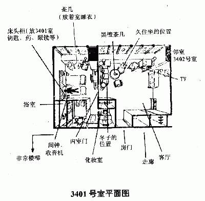 值班的神山警部【相当于警长。——译者注】那嘶哑的声音像机关枪一样朝着平贺猛射过来。 “平贺,刚向你的联络点打过电话。护城河旅馆发生了凶杀案,我已经让刑案班的人各自从家里赶到那边去。你也赶快去!” 搜查一课内第一二暴徒搜查股负责侦破与凶杀、伤害以及人身安全有关的案件。所谓的“刑案班”即刑事案件侦查班,由第一二暴徒搜查股内九个小组轮流担任,凡在值班期间发生的犯罪事件,都由当班小组为主负责侦破。为了应付突发事件,轮到值班的组员即便在执勤时间以外,也必须说明自己的去向。本周的刑案班正值村川组担任。 “护城河旅馆?” 平贺吃惊地扬起目光。神山警部将此当作是职业反应,一副不容争辩的口气催他快走。 “别啰嗦了,快走!我还要请负责勘查的现场勘查班马上出动。” 对警察来说,现场胜过一切解说。平贺也不必多问。 护城河旅馆3401号房间内挤满了警方人员。先遣搜查班和现场勘查班按照各自的职责正在有条不紊地进行现场勘查和取证。 俗话说,现场是侦查资料的宝库。侦查资料离案发时间越近越有价值。争分夺秒地赶到现场,是追捕凶手的最佳途径,却又无法保证现场的“原状”在勘查过程中不会变形或消失,因此要求现场搜查员非常机警。 平贺赶到现场时,已有几名组员到达,估计都是从家里赶来的,看来还没有被报社的记者们盯住。 “嘿!你辛苦了!” 平贺的顶头上司刑警部长内田已经先到。他扭动着野猪般粗壮的脖子迎上前来。他是一名老资格的刑警,年轻人都在背后叫他“老刑头”。奇怪的是,他与平贺特别投机。自从平贺被分配到搜查一课以后,他对平贺总是特别关照。内田是一个典型的老牌刑警,在追捕案犯中会感到力不从心,正因为如此,他的感觉特别敏锐。 “平贺,一个了不起的大人物挨整了!被害者是这家旅馆的社长。” 平贺也知道久住的名字,曾在周刊杂志上看到过他的照片。从房间的摆设和用具等,不难推测被害者是一个相当大的人物,但平贺没有想到这人物竟然如此显赫。 “先让我看看死者。” 内田将平贺从客厅带进更里侧的卧室里。平贺曾听一位朋友说过,这种类型的房间称为“套房”。 卧室和标准的双人房间一样,但配备的设施等用具都是很高级的。 从内室门走进去,久住政之助像虫子一样被杀害在左侧的卧床上。 看来久住是在熟睡时被人用极锋利的刀隔着薄毯从上往下猛刺致死的,血从被窝里渗出来染红了毛毯。 内田像剥开物品的包装纸似地掀起毛毯。 “正好刺中心脏。刀口有2厘米以上,估计是当场死亡。刀呈直角刺入心室,所以出血很多。血都渗透在被窝里,因此看上去出血不多,其实是大量出血,即便不是当场死亡,出这么多血也死了。干得真狠!” 内田刑警一直面无表情,这时他的脸抽动了一下。倘若是故意从毛毯上刺下去的,足见凶手的老谋深算。倘若直刺心脏,凶手便几乎无法躲避从被害者身上喷溅的血。 但是,在盖着毛毯的状态下行刺,从伤口飞溅的血迹全都被毛毯遮挡住。何况盖着毛毯,也不用害怕会惊醒被害者。在用锐器猛扎的冲击力面前,一两层薄毯起不了任何缓冲作用。 也许是凶手的穷竭心计,才使内田的表情微微抽动的。 被害者自然地伸直着双脚仰天躺在床的中央。也许是来不及感到痛苦就一命呜呼了,他的表情比较安详,与尸体的惨不忍睹很不相称。他光着身子穿着印有旅馆名的毛巾布睡衣,但不是很凌乱。右手向臀部下方稍稍弯曲,左手向身体外侧稍稍斜着伸出,手上没有任何东西。 倘若胸部没有出血,可算是睡姿安详。刀口离身体的正中线稍稍左偏,在第四根肋骨的间隙处,以身体为轴大致成直角扎入。这也许是为了使凶器准确扎入心脏深处而不至于被肋骨夹住。伤口仅此一处。由此可见,凶手判断准确极其自信,能将对手一刀毙命。 鲜血几乎都被床吸透,没有滴落地毯的痕迹。从血的颜色和凝固状况来看,离作案时间没过多久。 床头靠着墙壁,与左侧的卧床(被害者仰卧的那张)之间有一道勉强能挤过一个人的间隙。屋内非常整洁。卧床左侧(从客厅走进来是右侧)设有沙发茶几,在靠客厅的隔墙处设有办公桌和椅子,紧边上是行李架。甚至连纸篓、烟灰缸都井然有序地放在固定的位置上没有动过。废纸篓里一尘不染,烟灰缸也干干净净,保持着服务员打扫过的模样。(插图1) ![]() 枕边的床头柜上设有室内电话,还有3401号房间的钥匙、估计是被害者物品的手表和眼镜,以及装有常用药的小药瓶,里面用去大约四分之一药品。床头柜上离这些小物品稍稍远一些,还放着鸭嘴壶和玻璃杯。杯底留有大约一厘米左右的水。 “被害者是右撇子吧。” 内田刑警说道。 “你怎么知道的?”平贺问。 “因为他睡觉的卧床,仰躺着时床头柜正靠着床的右侧。” 的确,倘若没有伏趴着睡觉的习惯,对右撇子来说,也许床头柜靠着右侧枕边(仰卧着时)即被害者的卧床一边更方便些,但以此判断是右撇子还为时过早。总之,这马上就会弄明白的。 床头柜的下部设有收音机和闹钟,时针正指8点45分。看闹铃针指着7点,也许7点钟时就已经为这位再也不会醒来的主人徒劳地闹个不停。 闹铃针和手表的时间完全一致。两个时钟即便在主人死去后也忠于着职守。 平贺注视着药瓶。 “他在服用安眠药吧!” 他看着贴在瓶上标记“异戊巴比妥制剂”喃语道,难以判断用掉的