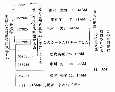 但是,代办订房手续从上午11点24分缩短到8点56分。倘若再能缩短两个小时,桥本的现场不在证明就能被打破。已经到了最后一步。 必然会有在上午7点前后领取057924住宿登记卡的方法,应该有的。上午7点左右来总服务台领取住宿登记卡的人,绝对必须是桥本本人或他的同案犯。服务员绝不可能将毫无关系的其他客人搞错。 平贺再次将星野找来。他比刑警更觉得烦,这是不言而喻的。 但是,平贺对屡次找他表示抱歉,并寻问10月1日上午7点左右将住宿登记卡发放给桥本模样的人的服务员还在不在。 幸运总是追随着平贺。那位服务员虽然昨晚是夜班,但现在还没有走,因此不久便赶到平贺的前面。倘若没有找到那位服务员,平贺就不能捕获攻占桥本最后堡垒的线索。 “在你百忙之中打搅你,真对不起!是你在10月1日上午7点时,将住宿登记卡交给皇家宾馆叫桥本先生的那个人吗?” “没错呀!这件事,你还要问几遍啊?” 服务员在客人的面前总是满面堆笑,此刻却绷紧着脸。 “那么,我开门见山吧。看这登记卡编号和订房时间,桥本先生必须是在平木一夫订房的8点56分之后领取住宿登记卡,否则就不对了。” 平贺毅然地说道,并将登记卡按订房时间的顺序排列在服务员的面前。服务员的目光流露出好奇,小林刑警茫然地站在一边。 小林刑警的模样就像是见平贺如此投入而不得不在此奉陪一样。 服务员凝视着住宿登记卡,好一会儿,才稍稍抬起头来。 “想起来了。那人是在7点左右来的,说生怕写坏了,要了三张住宿登记卡。” “他一个人要了三张?……” “预约倘若是两个人,除了夫妇之外,每个人都要记录,所以要求多领一张卡片备用也没什么可奇怪的。” “但是,桥本的房间是单人房。” “他的房间有沙发床,所以也可以睡两个人。这种房间也称两用双人房。” 星野在边上插嘴道。 “但是,预约是一个人吧?” “预约的房间倘若是带沙发的单人房,即便临时增加到两个人也没有关系。对旅馆来说,还希望如此。而且,一个人预约结果变成两个人,或相反的人员变更,在旅馆里是很常见的。” 星野补充道。 领取三张住宿登记卡,将编号最大的住宿登记卡留下,编号小的两张住宿登记卡交还总服务台。这就足以将与11点以后代办订房手续之间的缺号(不连续的幅度)缩小。不仅如此,还能够通过交还的两张住宿登记卡,故意将057924的订房时间推迟(见表AMS:56—AMg:16)(插图9)。安排周密,一箭双雕。 ![]() 但是,因此而必须将两张住宿登记卡交还给总服务台,而且要尽早。要说为什么?因为在交还922和923之前倘若下一位客人(李是在7点21分)用925排列在921之后,那么桥本的924是在吉冈订房的6点48分至李订房的7点21分之间领取的事实就会得以败露,平贺对此进行核实。 “当时马上就还了呀!我按他的要求给了他三张,他好像改变了主意,还了我两张。” 虽是受到追捕的凶手,但平贺对如此周密的做法仍感到惊叹。倘若当场交还,不仅925来不及插入921和924之间,而且也没有领取后再特地去还的明显反常。偌若识破一次领取三张当场交还两张的奸计,就能确认剩下的一张924在交还的两张(922和923)被使用(由李和平木使用)之前曾被领取过。 在吉冈和李的住宿登记卡上清晰地打印着的时间,证明着桥本的住宿登记卡是在上午6点40分至7点21分这段时间里被领取的事实。他是在11点24分将住宿登记卡交还给总服务台的。 这显然很不合理。 小林刑警这个势利的人,脸上也突然变得活跃起来。 “何况那天有近二十名客人,全都是凌晨2点之前到达,前一天晚上来迟了,是在旅馆结账截止以后到达的。” 星野补充道。就是说,本来是前一天的客人,但在半夜零点以后办理订房手续,所以就算作是后一天的客人。 刑警对那些客人不感兴趣,便让夜班下班的服务员先回去。 “不过,是谁接待这个叫竹本的客人的?” 平贺出示竹本的住宿登记卡。 “竹本操,11点42分。对了!是我去午休后受理的吧,字是大泽君签的。” 星野无意中喃语道。不料,被平贺听到了。 “午休有规定时间吗?” “日班总是从11点半起休息一个小时。” “11点半!” 平贺这才知道桥本选择11点24分的微妙含义。他在选择这个时间之前,对新东京旅馆已经偷偷地作了彻底探查。 倘若在11点之前办理订房手续,因为客人少,与前面住宿登记卡的时间间隔就会太长(调查的目光会关注到可疑住宿登记卡的前后)。但是,与中午结账退房时间接得太近,办理订房手续的客人之间的间隔就会变小,与7点21分前领到的住宿登记卡编号之间的不连续幅度就会拉开。 经过不知多少次的打探,最后桥本得到了7点到11点之间办理订房手续的客人最少的统计值。10月1日那天11点24分,就是桥本依靠统计值下的赌注。倘若这个统计值在10月1日那天出了很大的偏差,那么住宿登记卡上的诡计就会被人一眼识破。 桥本非常相信这个统计值,同时也没有想到警方已经冲破层层障碍追查到了这一步。 倘若万一查到这一步,以备万一,才指使竹本一个人担任两个角色去办理订房手续。而且,为了不使总服务台的服务员识破,这个“11点24分”就有着极其重要的含义。就是说,一到11点半,星野就会因午休离开总服务台。 平贺再次悟察到,现在他们面对的凶手,与以前追捕的人性丧尽手段凶残冷酷的罪犯有着本质上的区别。 “那位叫大泽君的人,现在还在吗?” |